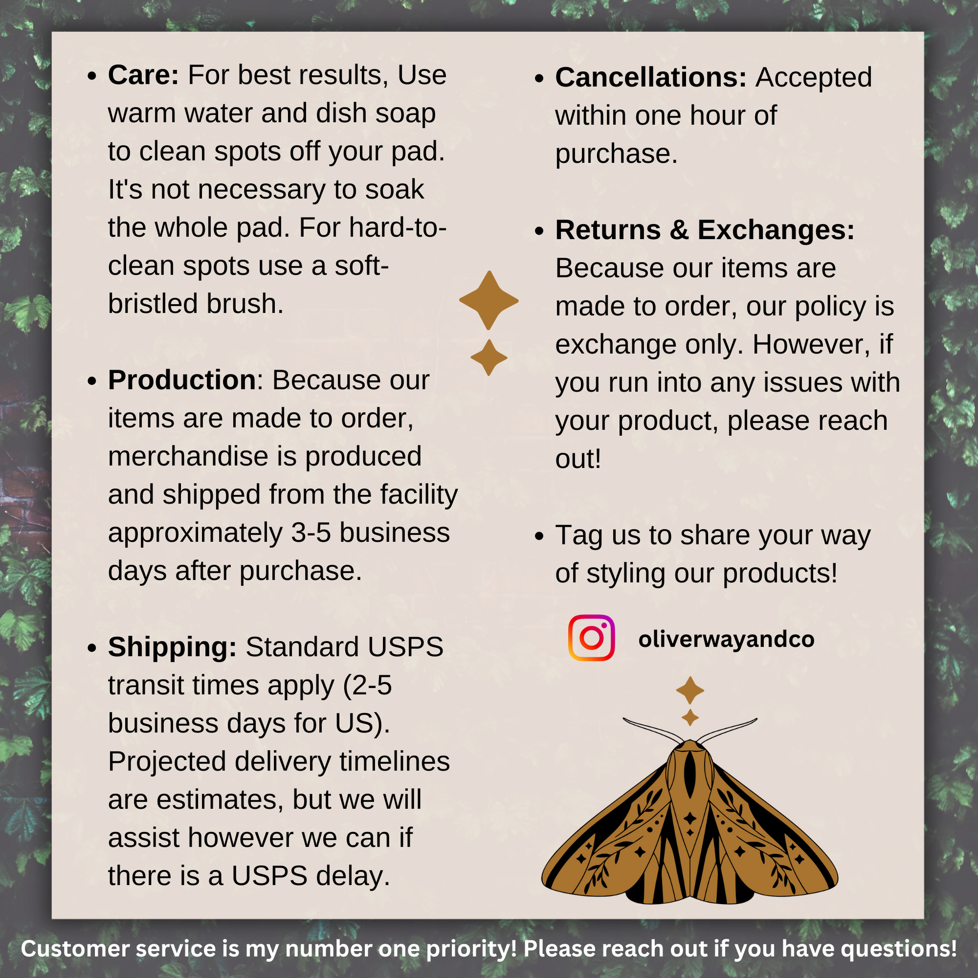 Returns are typically not accepted, but if there’s a problem with your order, please contact me. Including a photo of the issue is appreciated.